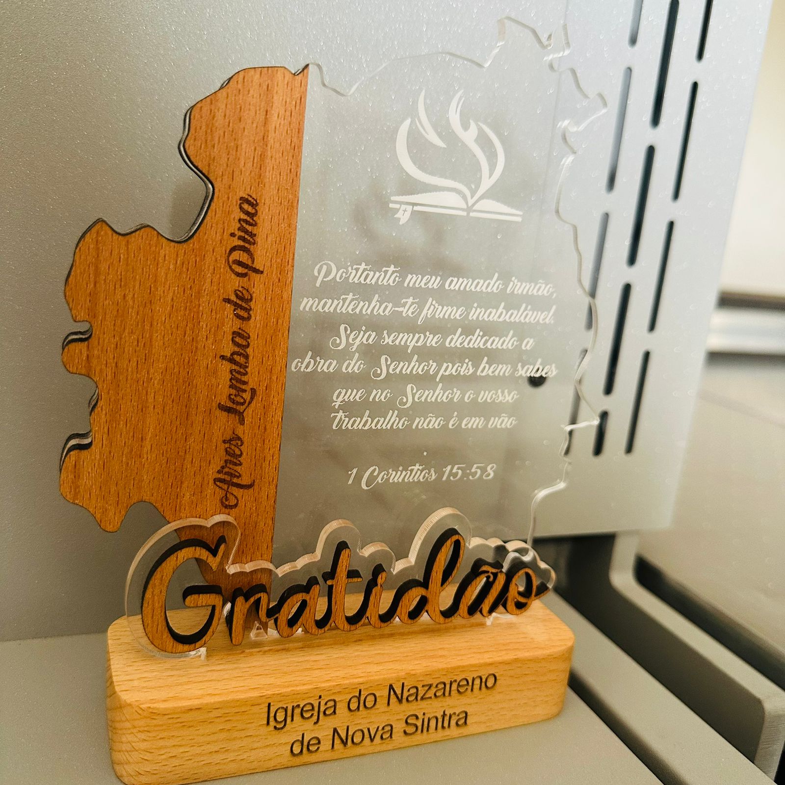 Troféu acrilico e madeira